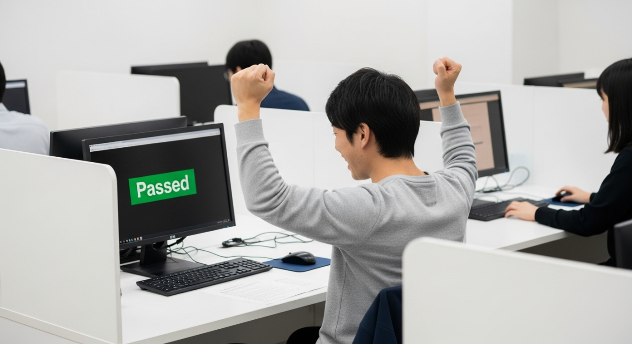 試験終了後のアンケートに答えると、「合格」の文字が表示されました。思わずガッツポーズをしてしまいました。