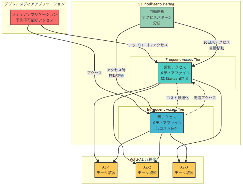 このような予測困難な変動に対して、手動でストレージクラスを管理することは現実的ではありません。S3 Intelligent-Tieringは機械学習を使用してアクセスパターンを自動分析し、最適なストレージtierに自動移動することで、運用オーバーヘッドなしにコスト最適化を実現します。また、複数AZでの冗長化により、Availability Zone損失に対する完全な耐性を提供し、取得料金がないため、予期しないアクセス増加時のコスト急増を防げます。