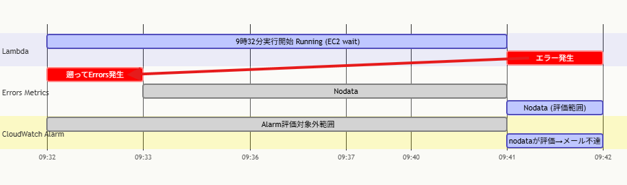 この「呼び出しからエラー発生まで約9分半」という処理時間が、CloudWatchアラームの評価期間(1分)を大幅に上回っていたことが、Lambda エラー 検知されない直接的な要因です。
