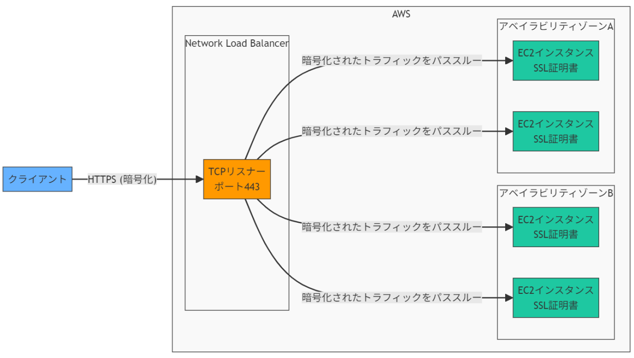 - NLBのTCPリスナー(ポート443)はトラフィックを透過的に転送するため適切