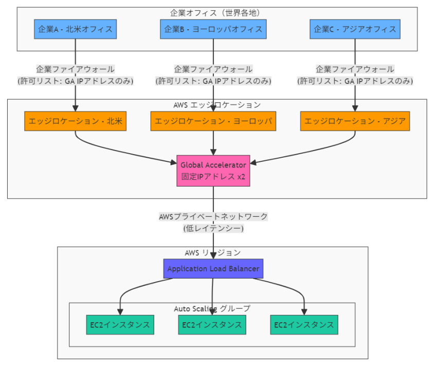 正解 AWS Global Acceleratorは、AWS グローバルネットワークを使用してユーザーとアプリケーション間のパフォーマンスを向上させるサービスです。Global Acceleratorは2つの固定エニーキャストIPアドレスを提供し、これらのIPを企業のファイアウォールで許可リストに追加するだけで済みます。トラフィックは最も近いAWSエッジロケーションにルーティングされ、AWSのプライベートネットワークを通じてアプリケーションに転送されるため、インターネット経由よりも低レイテンシーでアクセスできます。これにより、「最小限のレイテンシー」と「承認済みIPアドレスへのアウトバウンドトラフィックのみを許可する」という両方の要件を満たします。