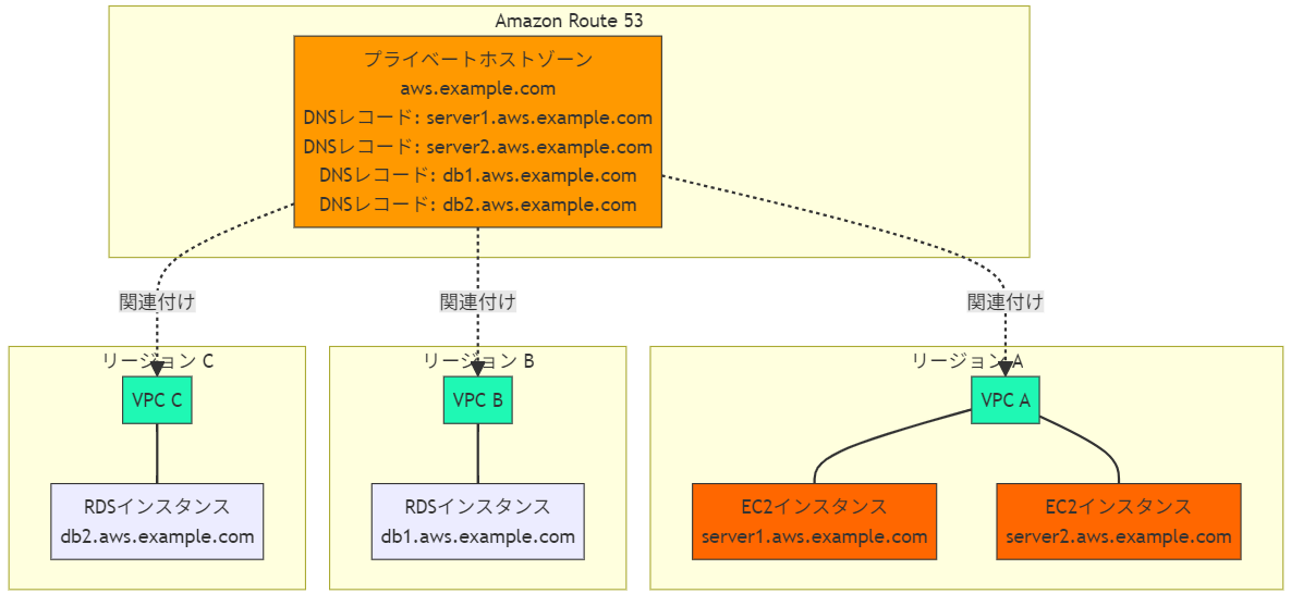 - 各リージョンにはVPCが配置されています(VPC AとVPC B)