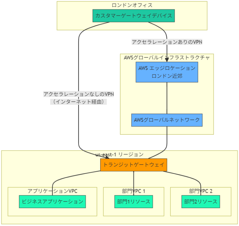 - AWSグローバルネットワーク: インターネットよりも信頼性が高く、レイテンシーの低いAWSのプライベートネットワークを使用