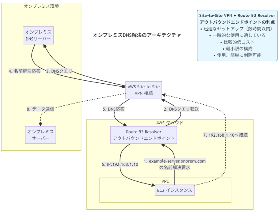 - データの暗号化: AWS Site-to-Site VPNを使用してIPsecトンネルを確立し、転送中のデータを暗号化します。