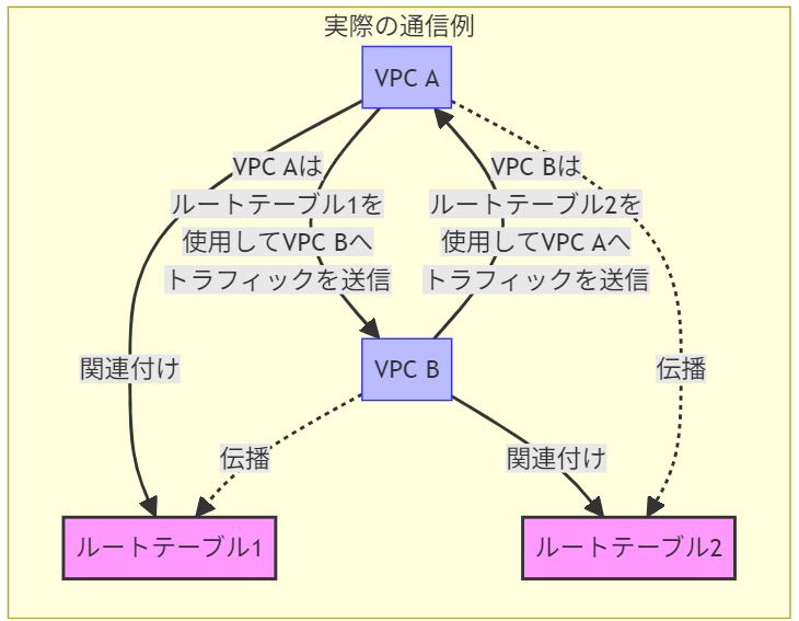 - トランジットゲートウェイAとトランジットゲートウェイBは、ピアリング接続によって接続されています