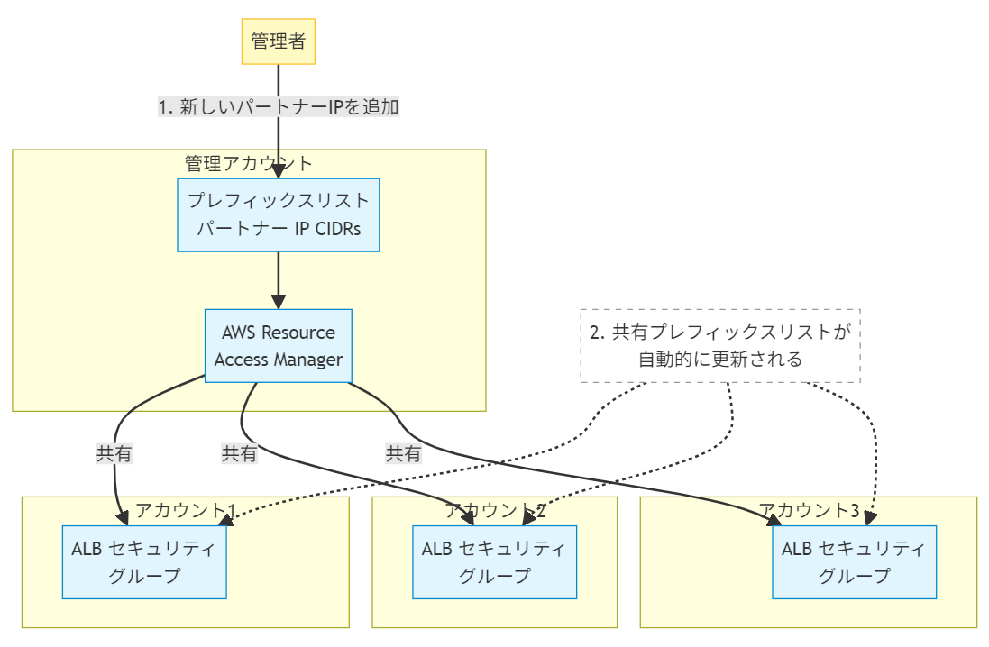 - スケーラビリティ – 新しいアカウントを追加する場合も同じプレフィックスリストを共有するだけ