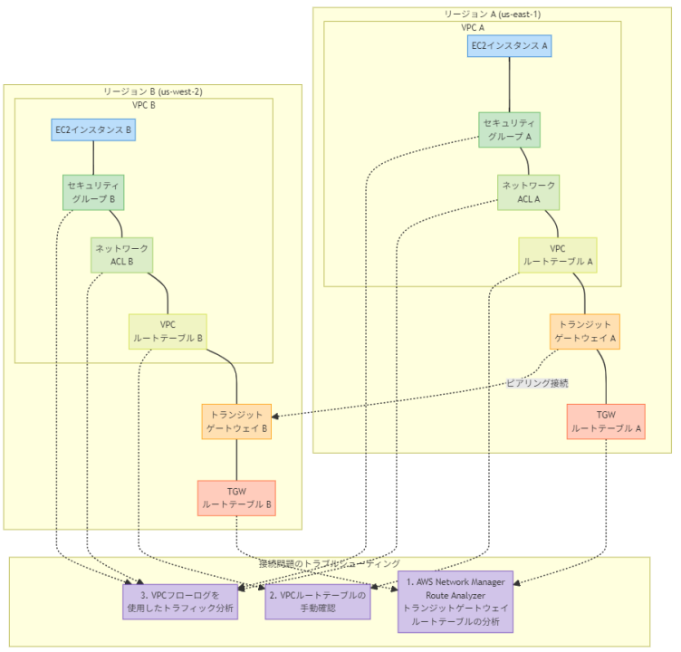 この接続では、異なるリージョン間の通信が行われるため、複数のコンポーネントが関与しています。問題を効果的にトラブルシューティングするためには、トランジットゲートウェイのルーティング、VPCルーティング、およびセキュリティ設定(セキュリティグループとネットワークACL)を適切なツールを使用して確認する必要があります。