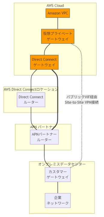 不正解 ホステッドパブリックVIFは、APNパートナーを通じて提供されるサービスですが、この場合はVPCとオンプレミスネットワーク間のプライベート通信が必要なため、パブリックVIFは適切ではありません。