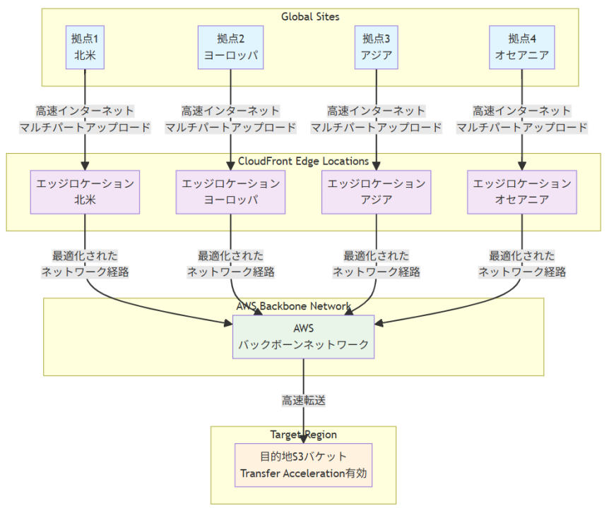 S3 Transfer Accelerationを使用した場合のデータ転送フローは以下のようになります。各拠点から収集されたデータは、まず最寄りのCloudFrontエッジロケーションに高速インターネット経由でアップロードされます。この際、マルチパートアップロードによって大容量データの並列転送が行われます。エッジロケーションに到達したデータは、AWSの最適化されたバックボーンネットワークを通じて目的地S3バケットに転送されます。このプロセス全体で、転送速度が大幅に向上し、運用の複雑さが最小化されます。