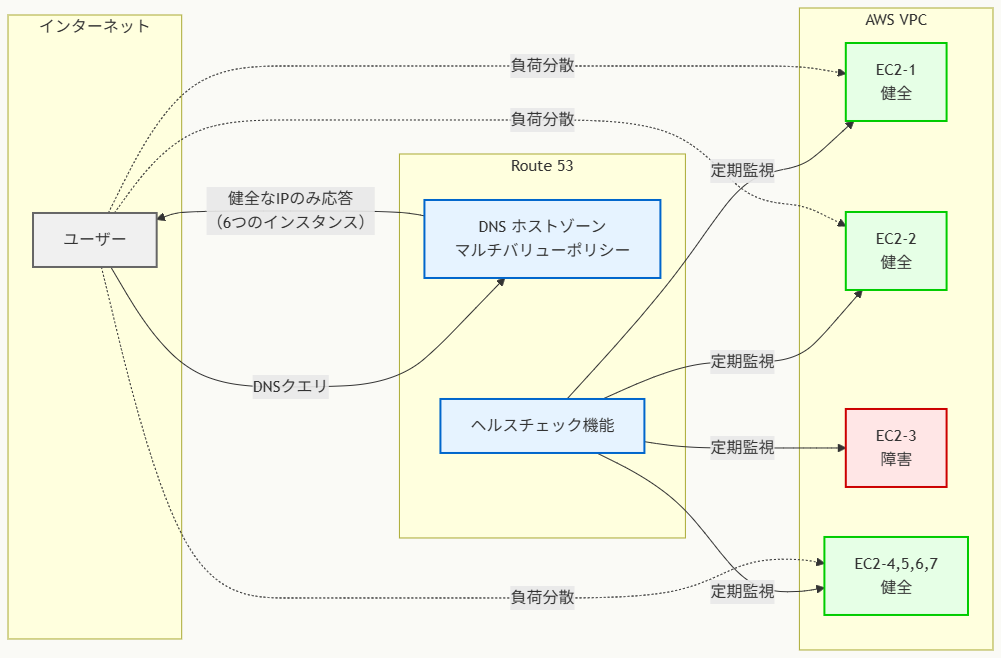 Route 53のヘルスチェック機能が各EC2インスタンスの状態を定期的に監視しています。HTTP/HTTPSプロトコルを使用してインスタンスの健全性を確認し、ヘルスチェックが失敗したインスタンスは自動的にDNS応答から除外される仕組みです。