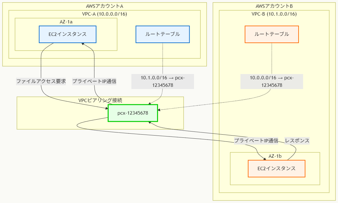 このアーキテクチャでは、異なるAWSアカウントのVPC-A(10.0.0.0/16)とVPC-B(10.1.0.0/16)間でVPCピアリング接続(pcx-12345678)を確立しています。VPCピアリング接続は論理的なネットワークリンクとして機能し、両VPC間でのプライベートIPアドレスを使用した直接通信を可能にします。この接続はAWSの分散インフラストラクチャ上で動作するため、物理的なハードウェアに依存せず、単一障害点が発生しません。