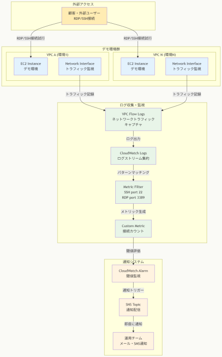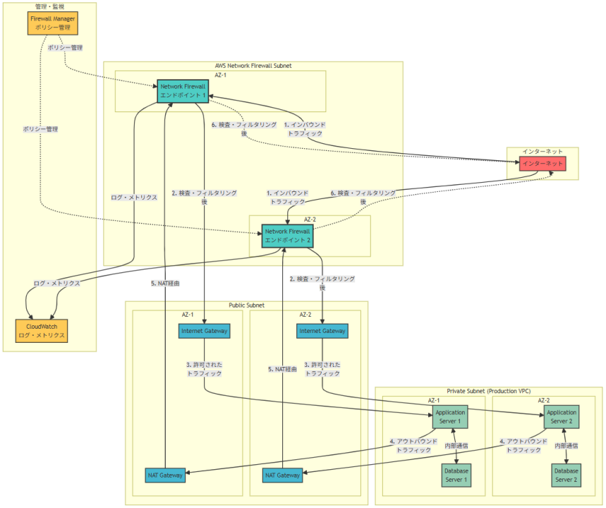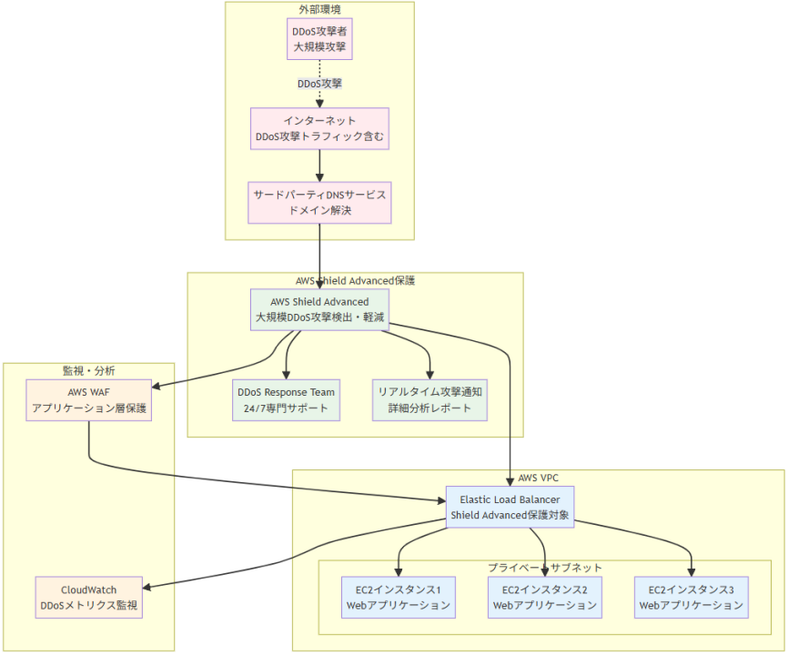 外部からのトラフィックはサードパーティDNSサービスを経由してAWS環境に到達し、AWS Shield AdvancedがELBレベルで大規模DDoS攻撃を検出・軽減します。Shield Advancedは機械学習ベースの検出エンジンにより、正常なトラフィックと攻撃トラフィックを区別し、攻撃トラフィックを自動的にフィルタリングします。ELBの背後にある複数のEC2インスタンスは、攻撃が軽減された正常なトラフィックのみを受信し、安定したサービス提供を維持できます。リアルタイム攻撃通知により、セキュリティチームは攻撃状況を即座に把握できます。